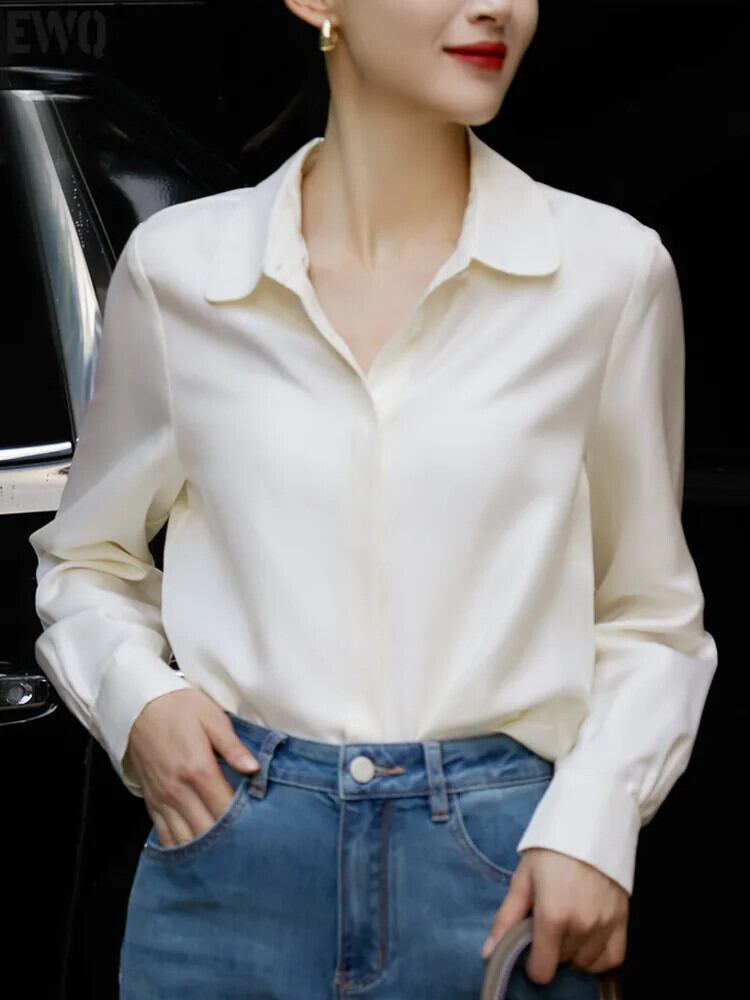 【EWQ】シンプル 長袖 グリーン ベージュ ラペル シングルブレスト シャツ オフィス シングルブレスト トップス 2024春夏 16U8287 ロング スプリング 春物 サマー 夏物 会社 学校 通勤や通学にも