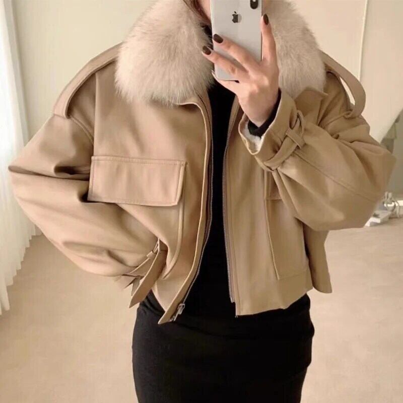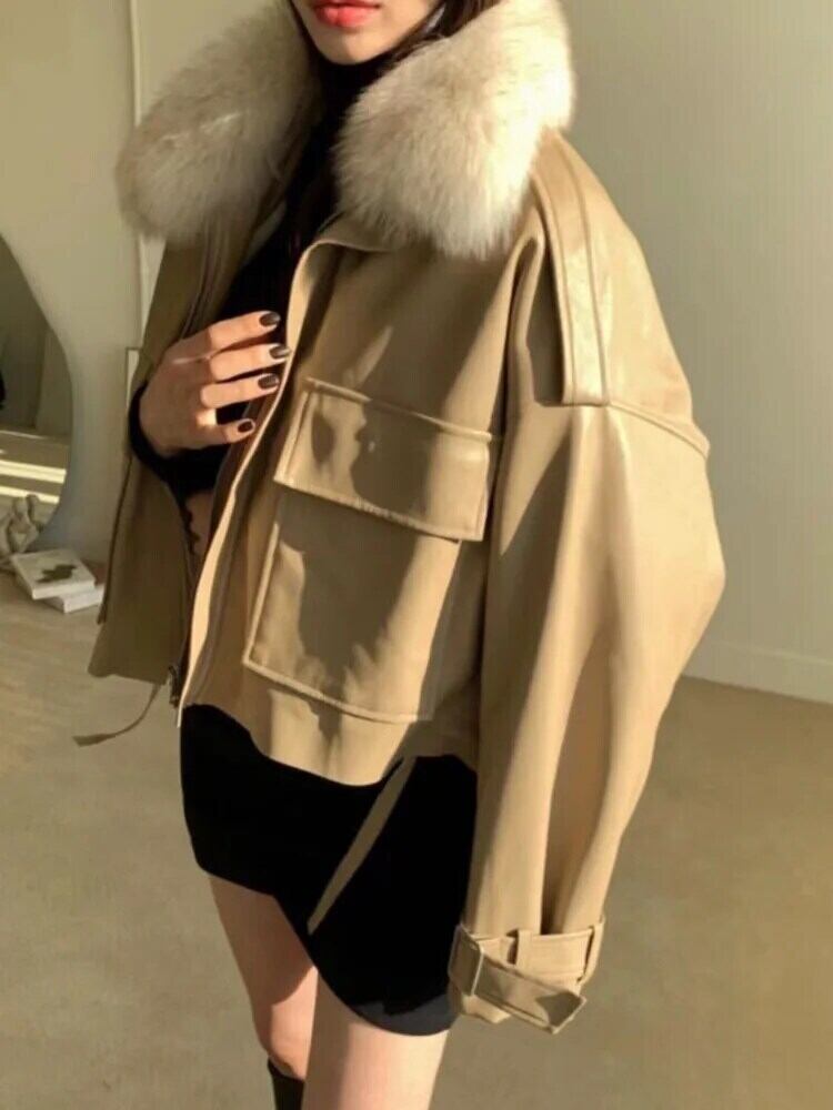 [EWQ] ストリート毛皮ラペルパッチワークジッパージャケットレザーボンバーオートバイラージポケットコート秋冬 U6488 オータム 秋物 ウィンター 冬物