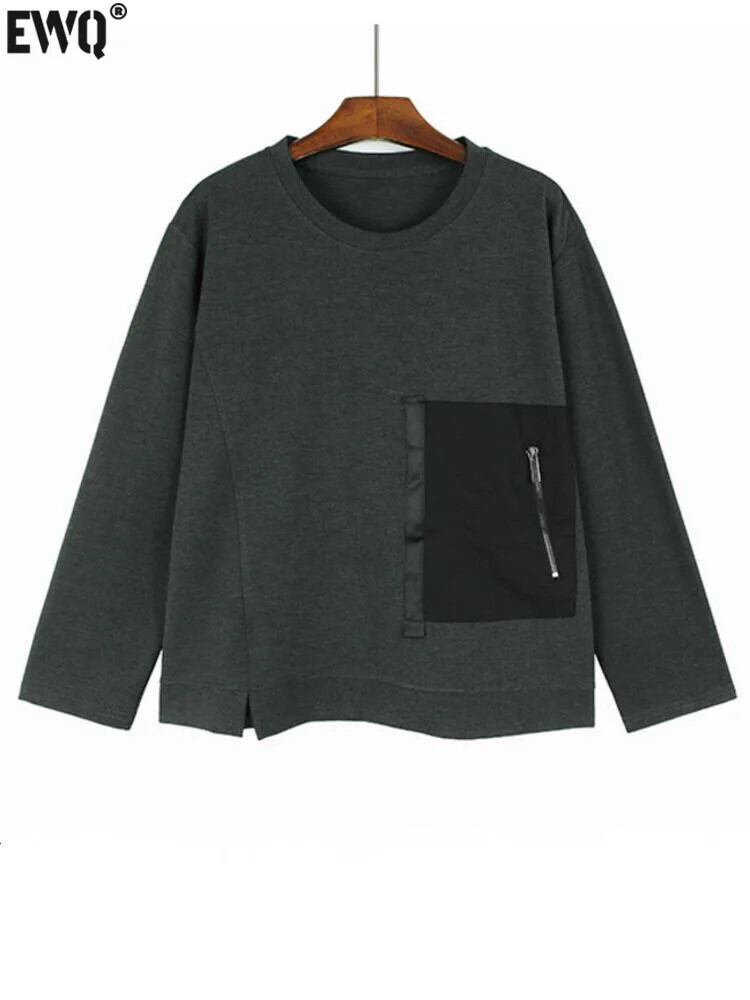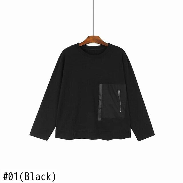 [EWQ] ソリッド ラウンドネック 長袖 Tシャツ ジッパー パッチ ポケット ルーズ オールマッチ トップス レディース 2024 春秋 16U7034 ロング スプリング 春物 オータム 秋物 Oネック ソリッドカラー