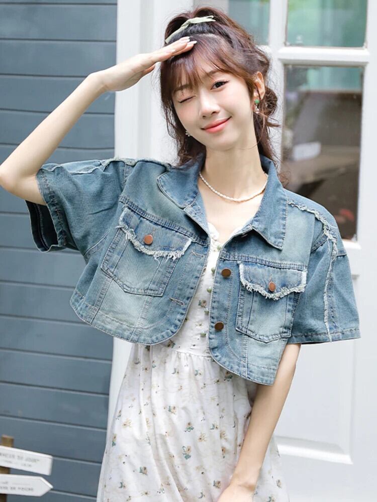 [EWQ] ストリート ラペル シングルブレスト コート オールマッチ 半袖 デニム ジャケット レディース 2024 春夏 16U8260 ショート ハーフスリーブ スプリング 春物 サマー 夏物