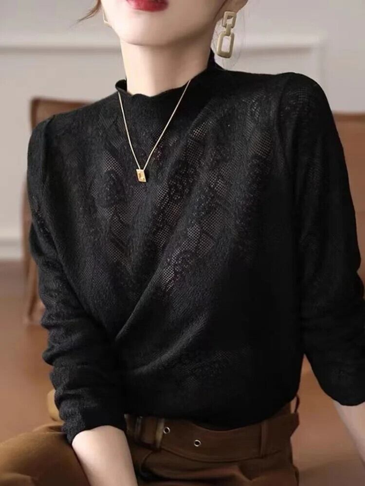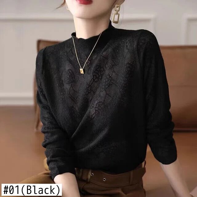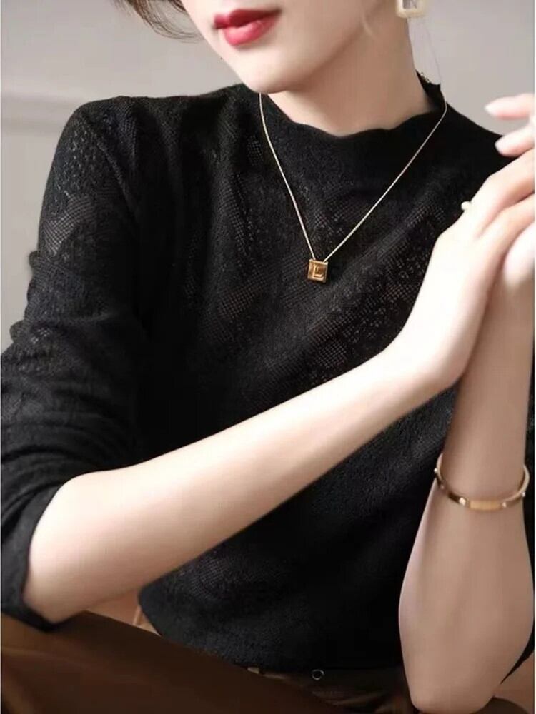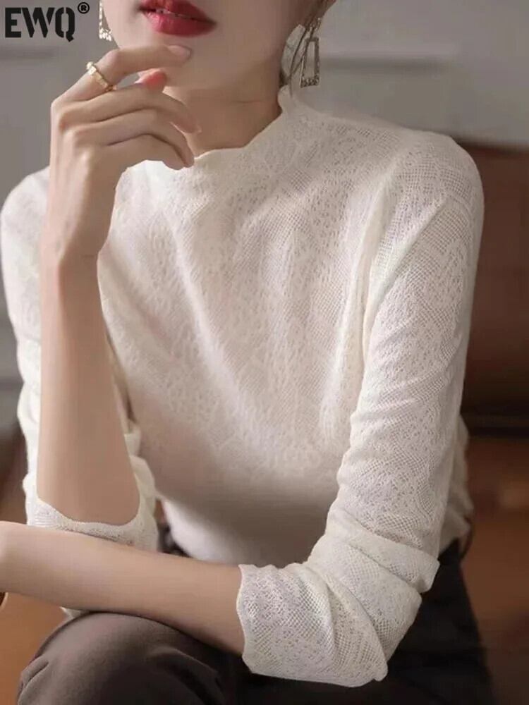 [EWQ] シンプルスタンドカラーカシミヤプルオーバーニットシャツセーターレディースレーススプライシングベーシックジャカードトップ2024春夏16U8306 スプリング 春物 サマー 夏物
