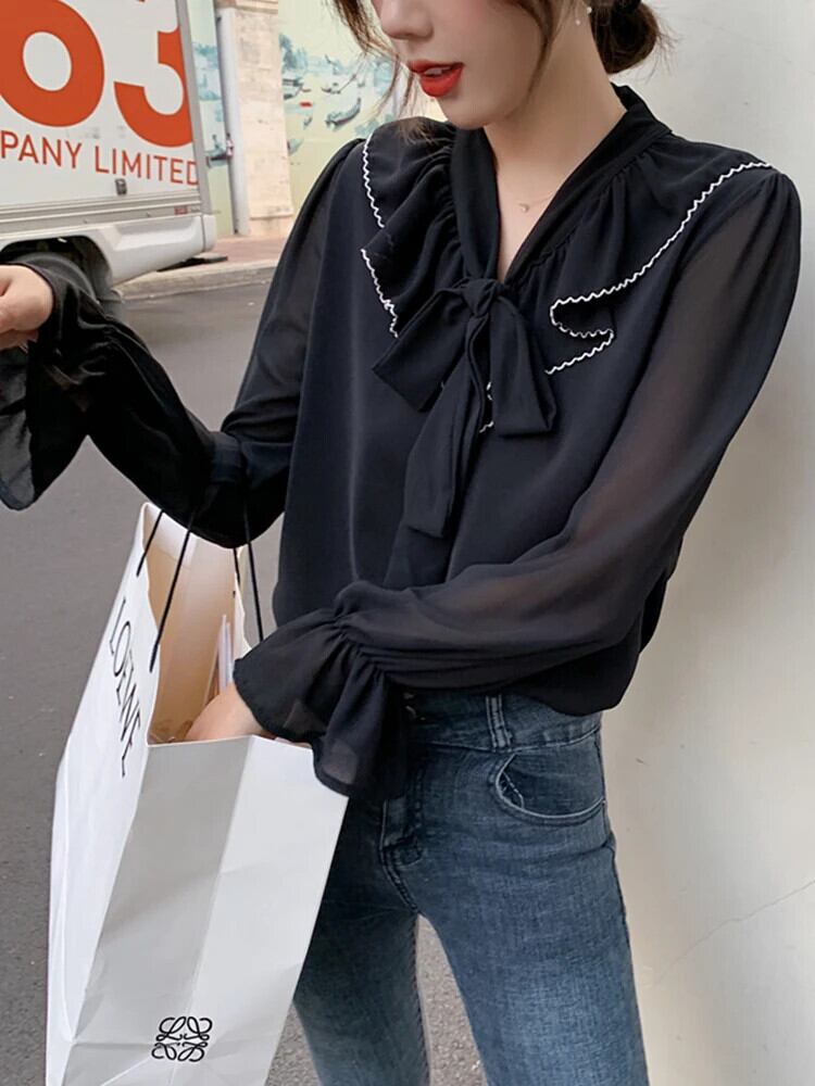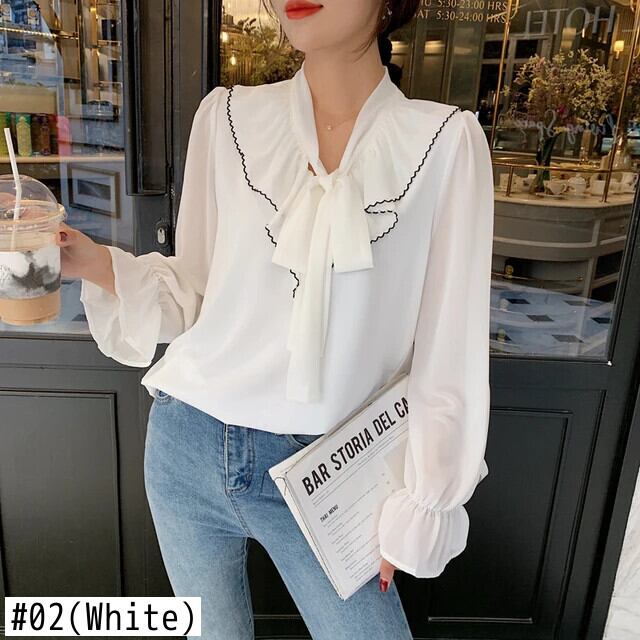 [EWQ] スタイル V ネックランタンスリーブソリッドカラーシフォンシャツ蝶ネクタイトップスブラウス 2024 春夏 リボン スプリング 春物 サマー 夏物 Vネック