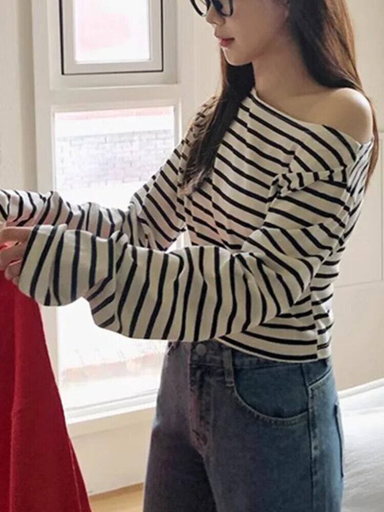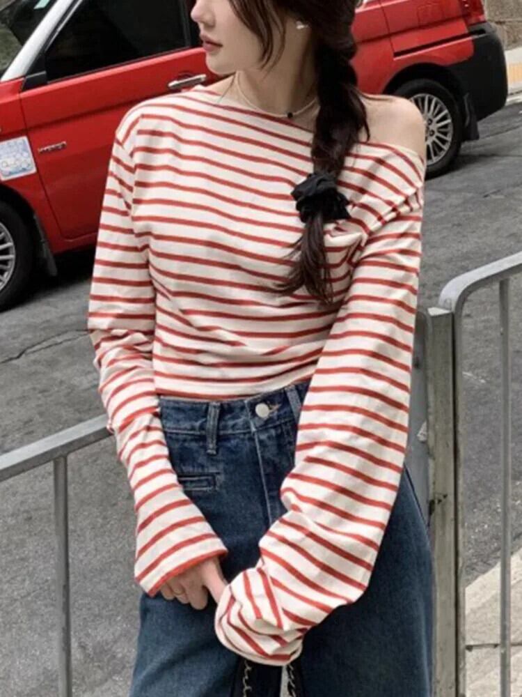 [EWQ] エイブルストライプ スラッシュネック 長袖Tシャツ レディース 万能プルオーバー ブラウス トップス 2024春夏 16U8562 ロング スプリング 春物 サマー 夏物