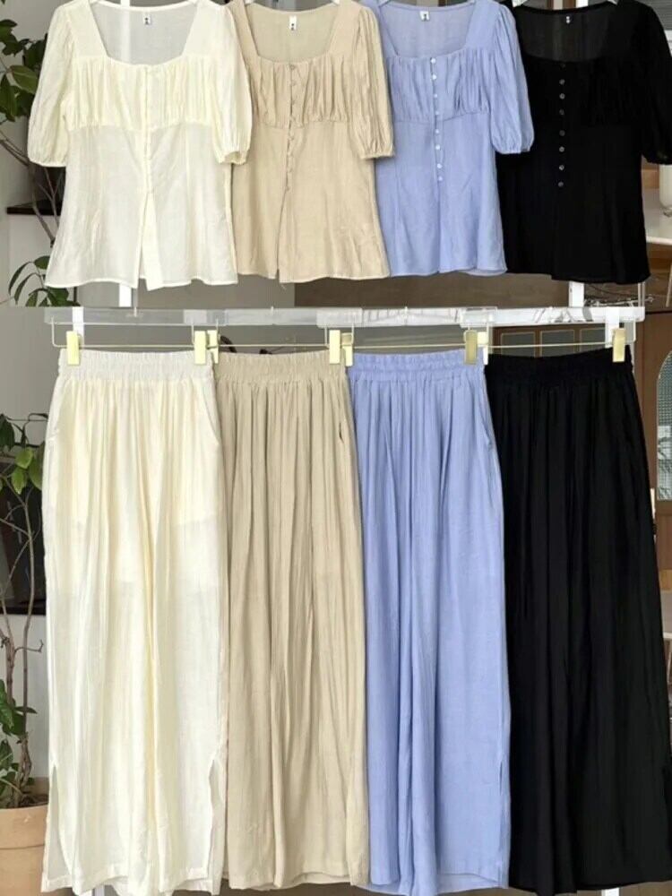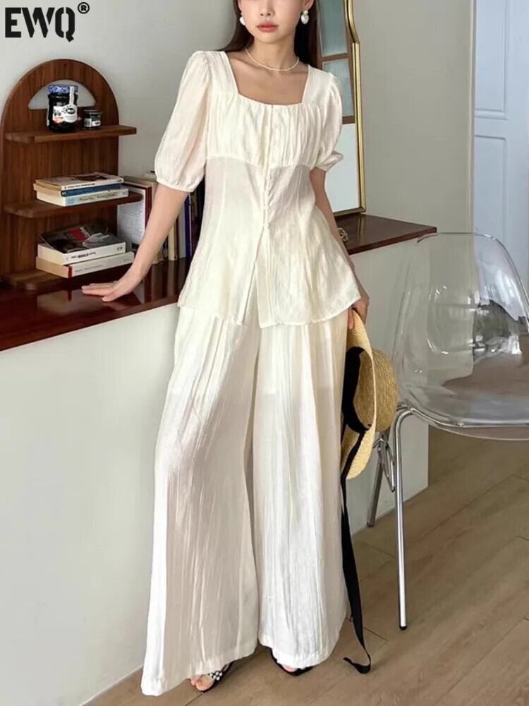 【EWQ】気質アップ スクエアネック オールマッチ 半袖シャツ ウエストスリット ワイドパンツ 2点セット 2024春夏 U8540 ショート ハーフスリーブ スプリング 春物 サマー 夏物 ワイドレッグ スクウェア