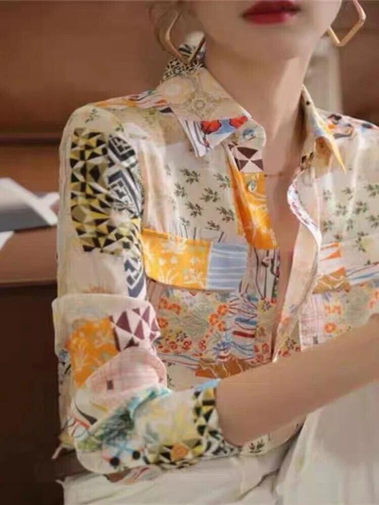 [EWQ] 万能長袖シャツ ポケットシフォンプリント コントラストカラーブラウス トップス 2024春夏 16U8290 ロング スプリング 春物 サマー 夏物 シルク