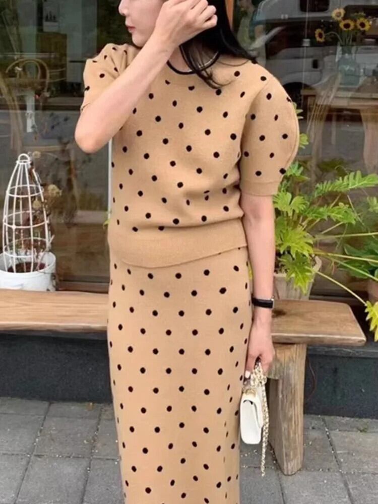 [EWQ] ラウンドネック ドット 半袖 プルオーバー ニット セーター ウエストラップ ヒップスカート 2枚セット 2024春夏 U8547 ショート ハーフスリーブ スプリング 春物 サマー 夏物 Oネック