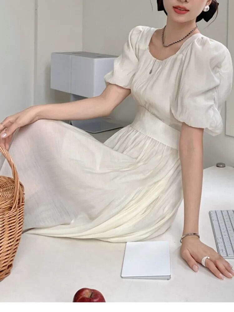 [EWQ] バブルスリーブ ソリッドカラー プリーツ ロングドレス スクエアネック ワンピース レディース 2024 春夏 23A7758 スプリング 春物 サマー 夏物 スクウェア