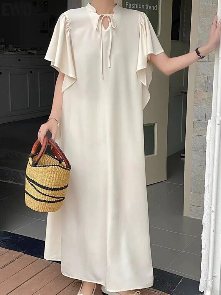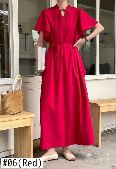 [EWQ] ese 蓮葉袖 Vネック レースアップ シンプル 無地 ロングドレス レディース 2024春夏 16U8330 スプリング 春物 サマー 夏物 ソリッドカラー