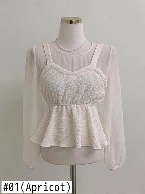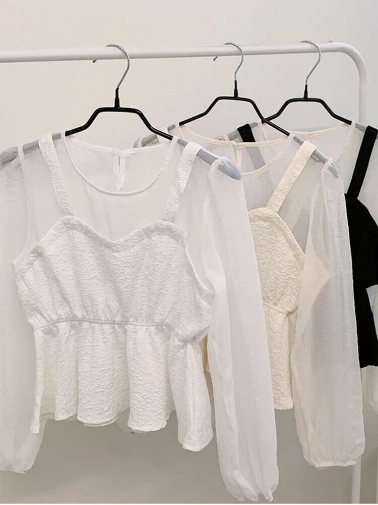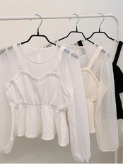 [EWQ] パッチワーク フェイク ツーピース キャミソール シャツ ウエストバンド スリム オールマッチ 長袖 ブラウス トップス 2024 春夏 16U8532 ロング スプリング 春物 サマー 夏物