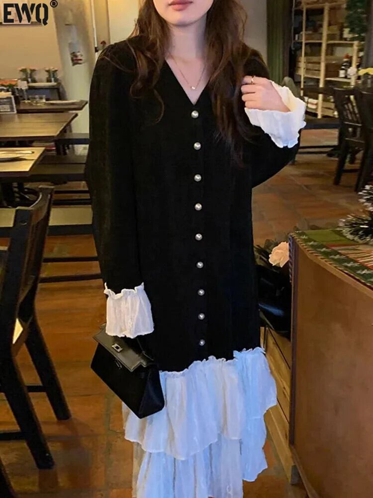 [EWQ] スタイル V ネックシングルブレストパッチワークレースドレスルーズロングドレス 2024 春秋 6U7334 スプリング 春物 オータム 秋物 Vネック