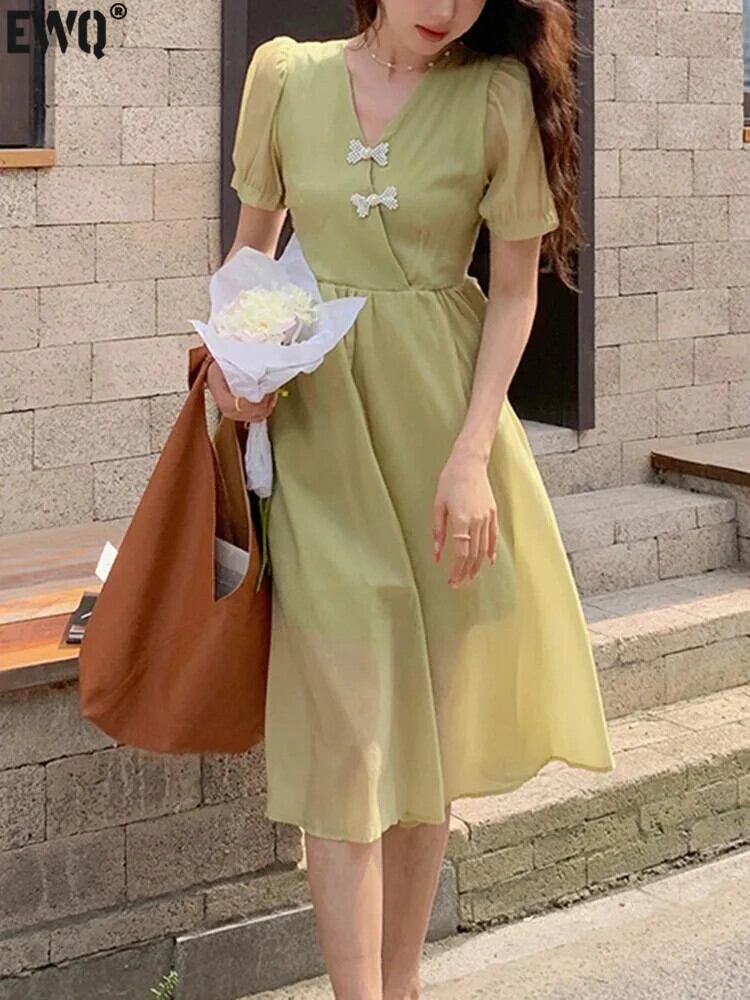 [EWQ] スタイルボウパールバックル V ネックドレス甘いレースアップブルー妖精ドレス 2024 春夏 A7756 リボン 大人ガーリー スウィート キュート カジュアル スプリング 春物 サマー 夏物 Vネック 真珠