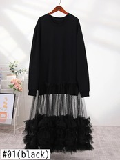 [EWQ] メッシュスプライスグリーンスウェットシャツドレス長袖ビッグサイズ O ネック Vestidos 2024 春秋長さ 127 センチメートル ロング スプリング 春物 オータム 秋物 Oネック