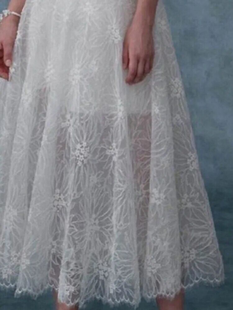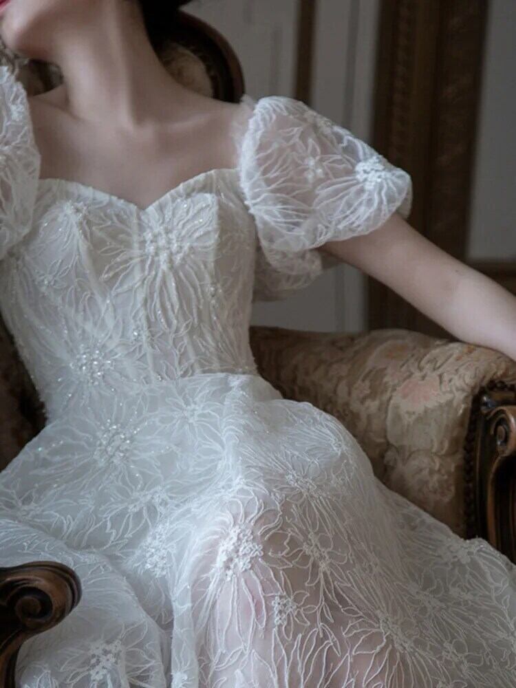 [EWQ] レースバブルスリーブアウトホワイトドレス半袖美しいロングスカート 2024 春秋 16U7264 ショート ハーフスリーブ スプリング 春物 オータム 秋物