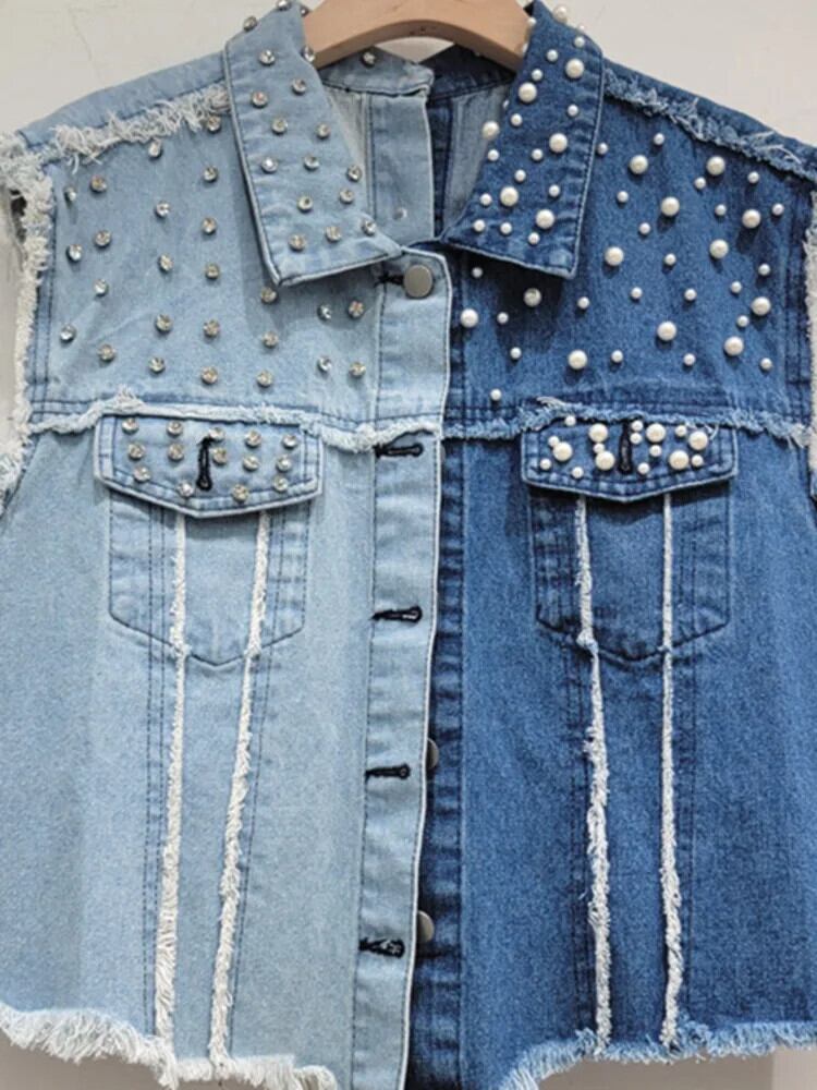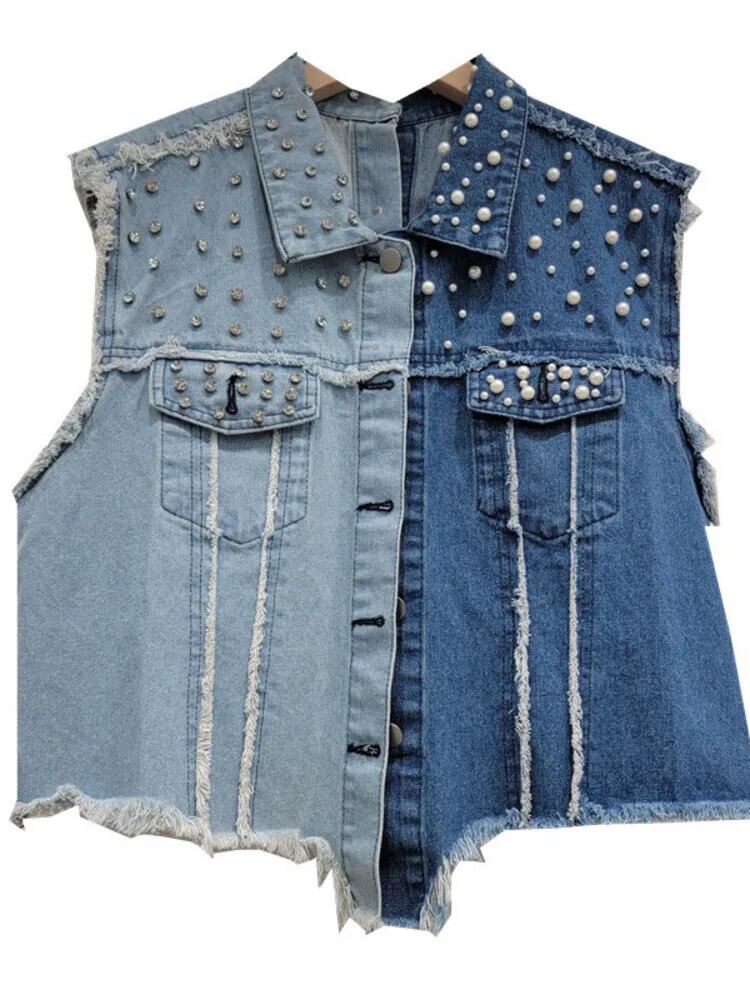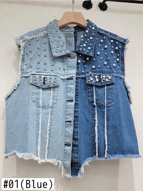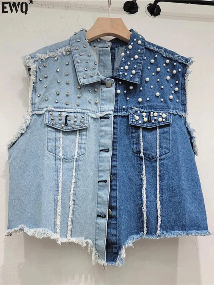 [EWQ] スタイルコントラストカラーパッチワークパールデニムベスト Y2K ルーズノースリーブトップ 2024 春秋 U7604 スプリング 春物 オータム 秋物 真珠