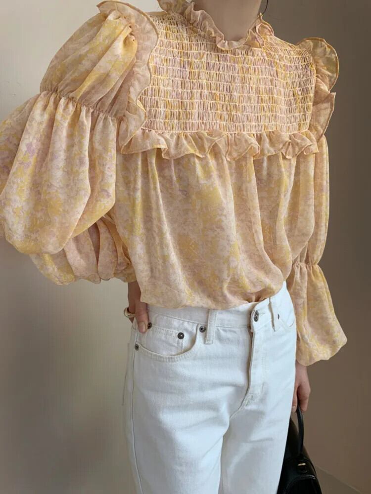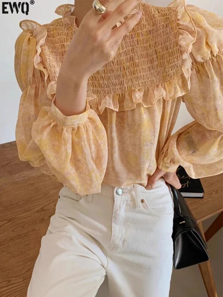 [EWQ] スタイル食用木菌エッジ パッチワーク シフォン シャツ 甘い花柄ブラウス トップ レディース 2024 春夏 7967 大人ガーリー スウィート キュート カジュアル スプリング 春物 サマー 夏物