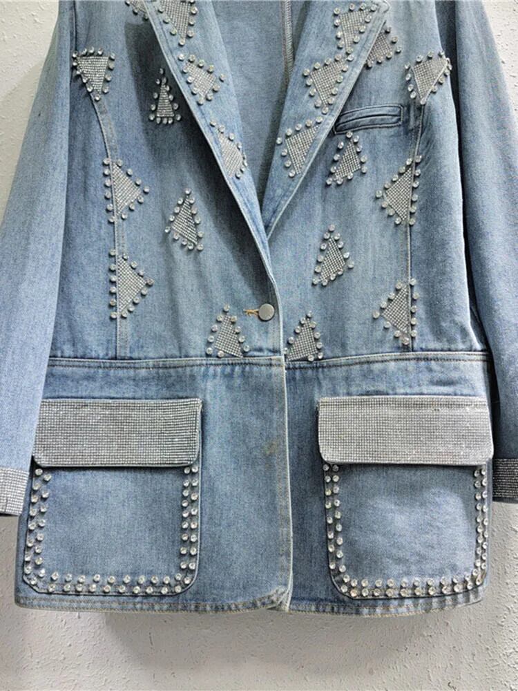 [EWQ] デニム スーツ ジャケット レディース ダイヤモンド スタッズ ビーズ シングルブレスト コート 2024 春秋 16U8768 スプリング 春物 オータム 秋物