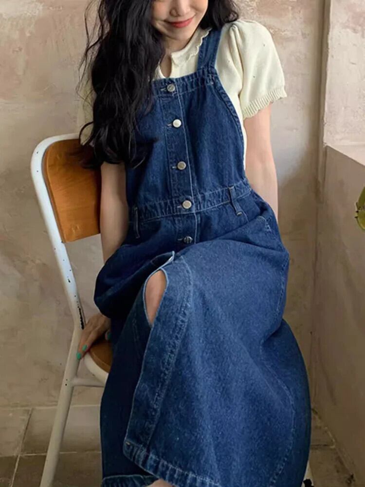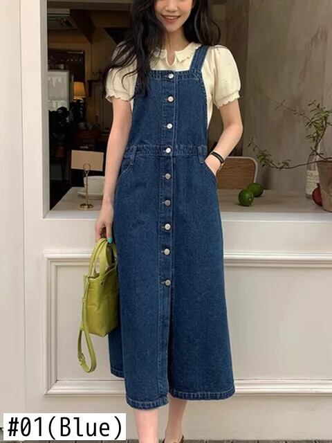 [EWQ] ストリートスクエアネックシングルブレストウエスト A ラインルーズデニムベストスリングドレス 2024 春夏 U8519 スプリング 春物 サマー 夏物 Aライン スクウェア