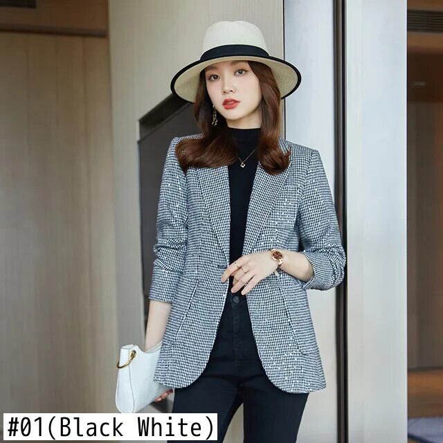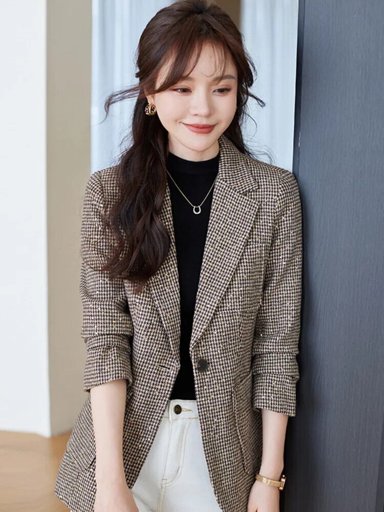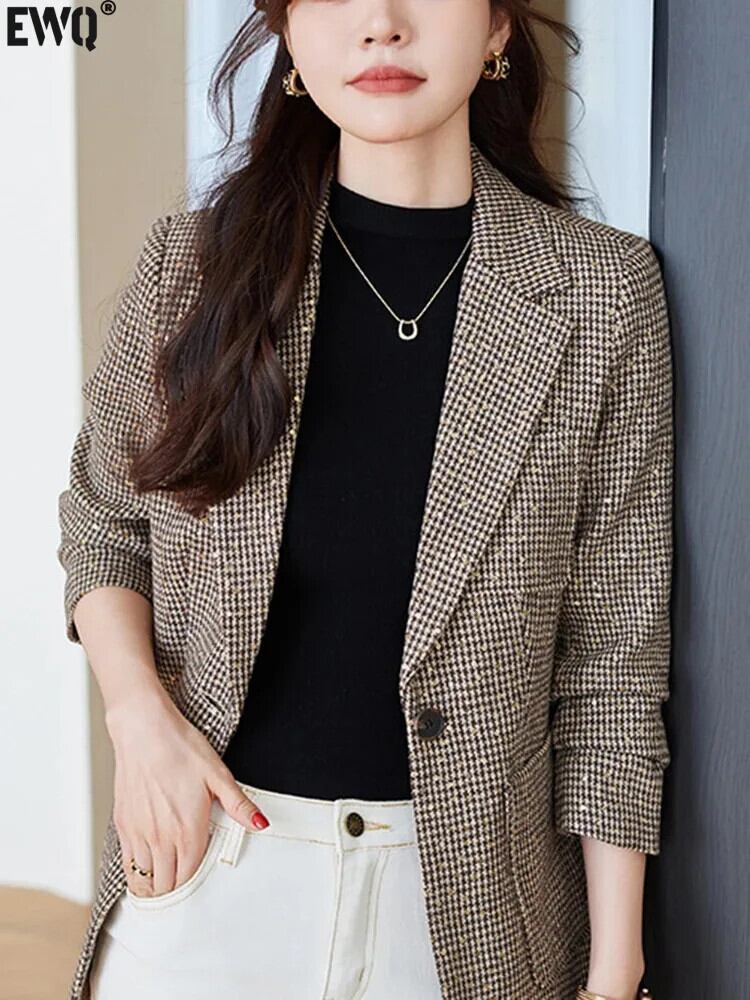 [EWQ] スパンコール シングル ボタン チェック柄 ブレザー コート オールマッチ オフィス コーヒー ジャケット レディース 2024 春夏 7812 スプリング 春物 サマー 夏物 会社 学校 通勤や通学にも