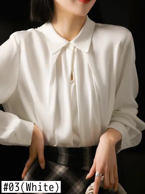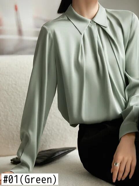 [EWQ] シンプル無地ボタンプリーツシャツ長袖ラペルブラックホワイトグリーントップス 2024 春夏 16U8298 ロング スプリング 春物 サマー 夏物 シルク ソリッドカラー