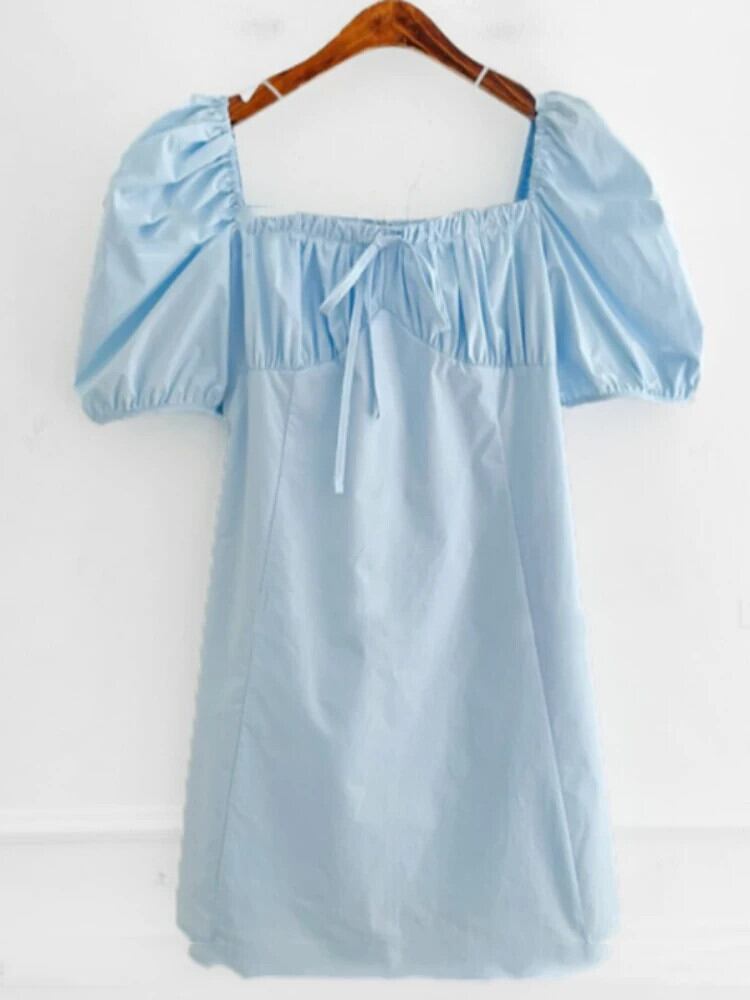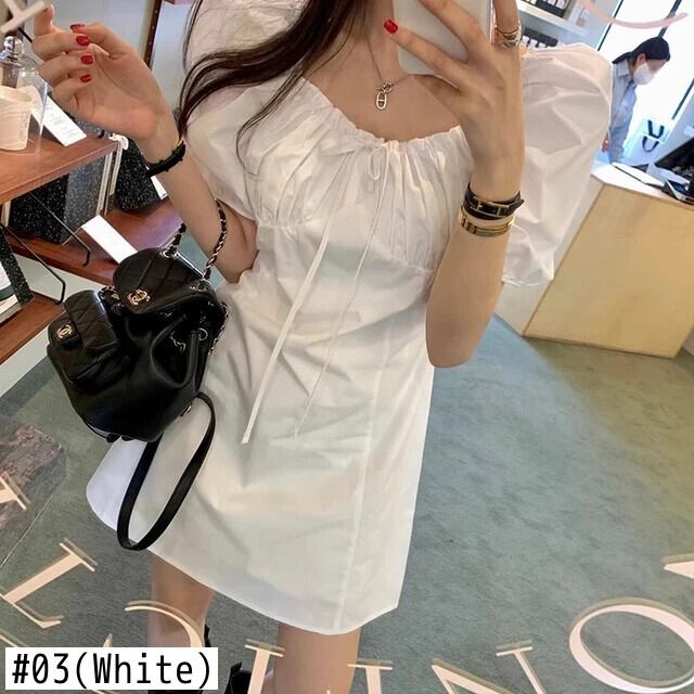 [EWQ] スクエアネックミニドレススリムウエストバブルスリーブショートソリッドカラースカート 2024 春夏 16U8554 スプリング 春物 サマー 夏物 スクウェア