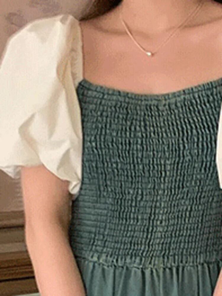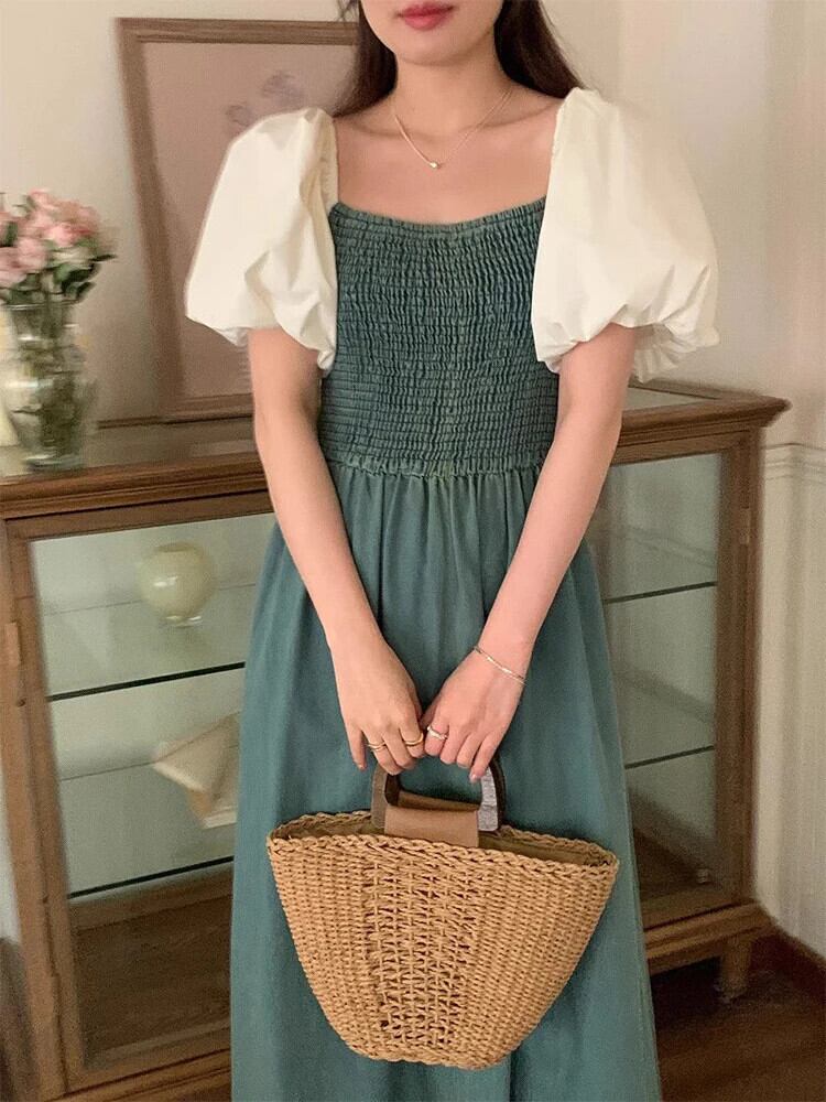 [EWQ] レディース スクエアネック ラップアップウエスト スリム スプライシング コントラストカラー バブルスリーブ デニム ワンピース 2024 春夏 16U8525 スプリング 春物 サマー 夏物 スクウェア