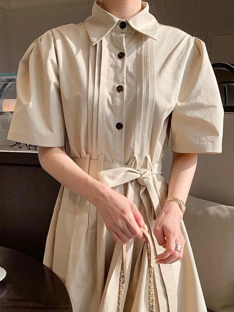 【EWQ】ラペルシングルブレスト折り返しタイストラップウエスト半袖ワンピース2024春夏 U8560 ショート ハーフスリーブ スプリング 春物 サマー 夏物