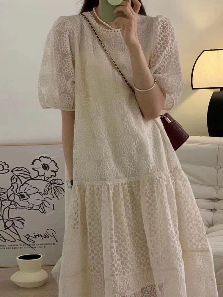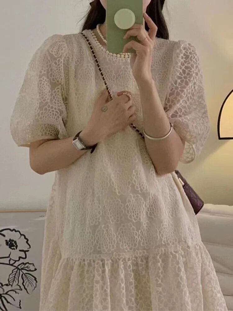 [EWQ] 美しいアプリコット O ネック レース フック フラワー ルーズ バブル スリーブ ロングドレス レディース 2024 春夏 16U8535 スプリング 春物 サマー 夏物 Oネック フラワーデザイン