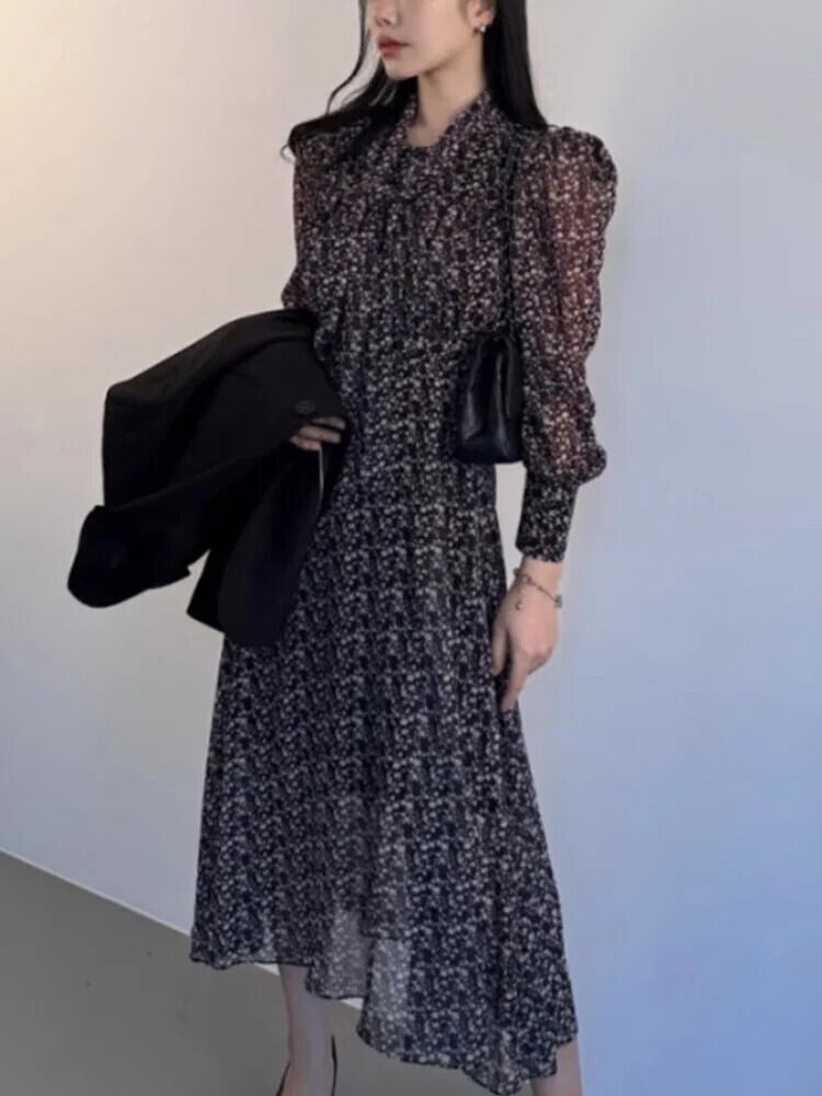 [EWQ] スクエアネックレースアップ花ウエストルーズバブルスリーブロングドレス 2024 春夏 16U8546 スプリング 春物 サマー 夏物 フラワーデザイン スクウェア