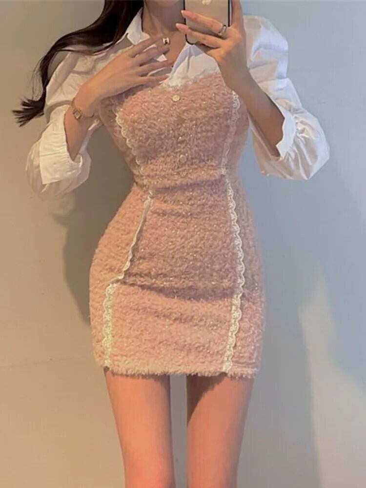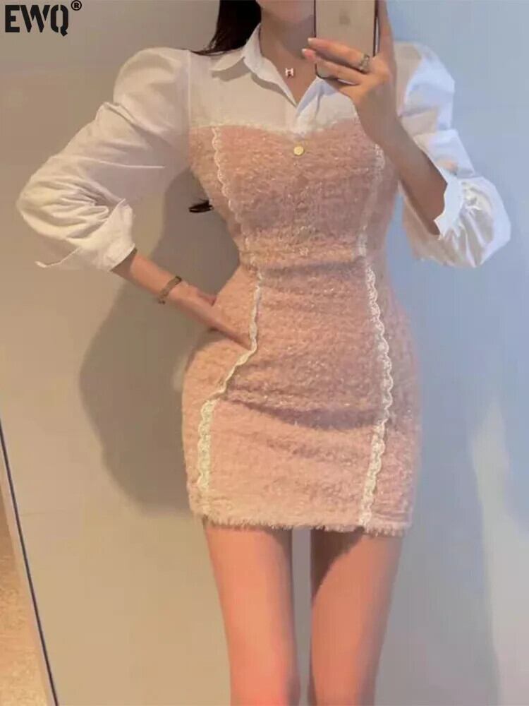 [EWQ] スタイルコントラストカラーパッチワークフェイクツーピースシャツドレスセクシーミニドレス 2024 春秋 987 スプリング 春物 オータム 秋物