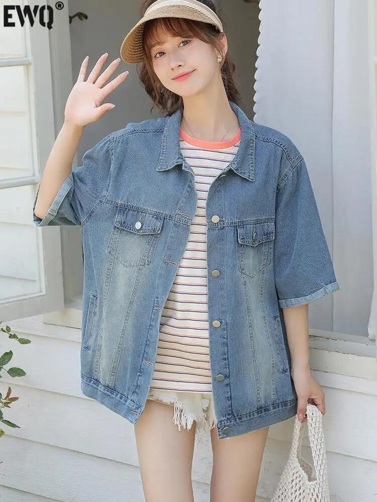 [EWQ] ブルーショルダーパッド入りデニムコートレディース半袖バージョンルーズシングルブレストジャケット 2024 春秋冬 U8264 ショート ハーフスリーブ スプリング 春物
