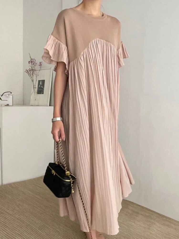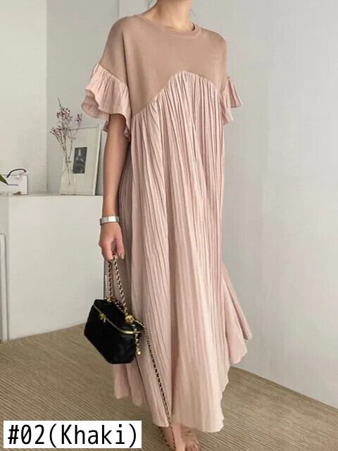 [EWQ] 綺麗ルーズOネック パッチワーク プリーツ フリルエッジ 半袖 ロングドレス レディース 2024春夏 16U8568 ショート ハーフスリーブ スプリング 春物 サマー 夏物