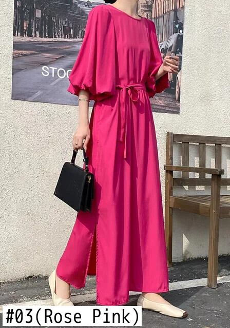 [EWQ] Oネック バブルスリーブ ロングウエスト レースアップ スリット ワンピース レディース 無地 2024春夏 16U8343 スプリング 春物 サマー 夏物 ソリッドカラー