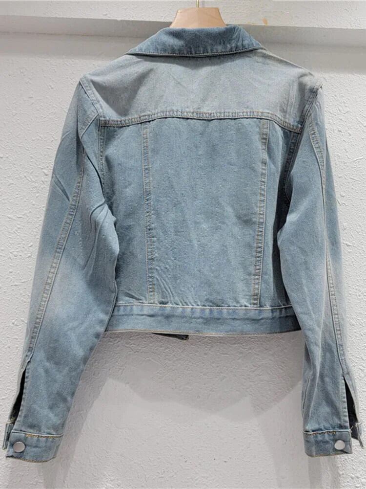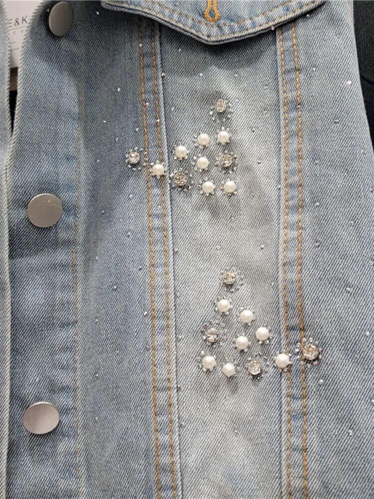 [EWQ] 2024 春秋ルーズダイヤモンドデニムラペルシングルブレストコートレディースビーズショートジャケットトップ 16U8766 スプリング 春物 オータム 秋物