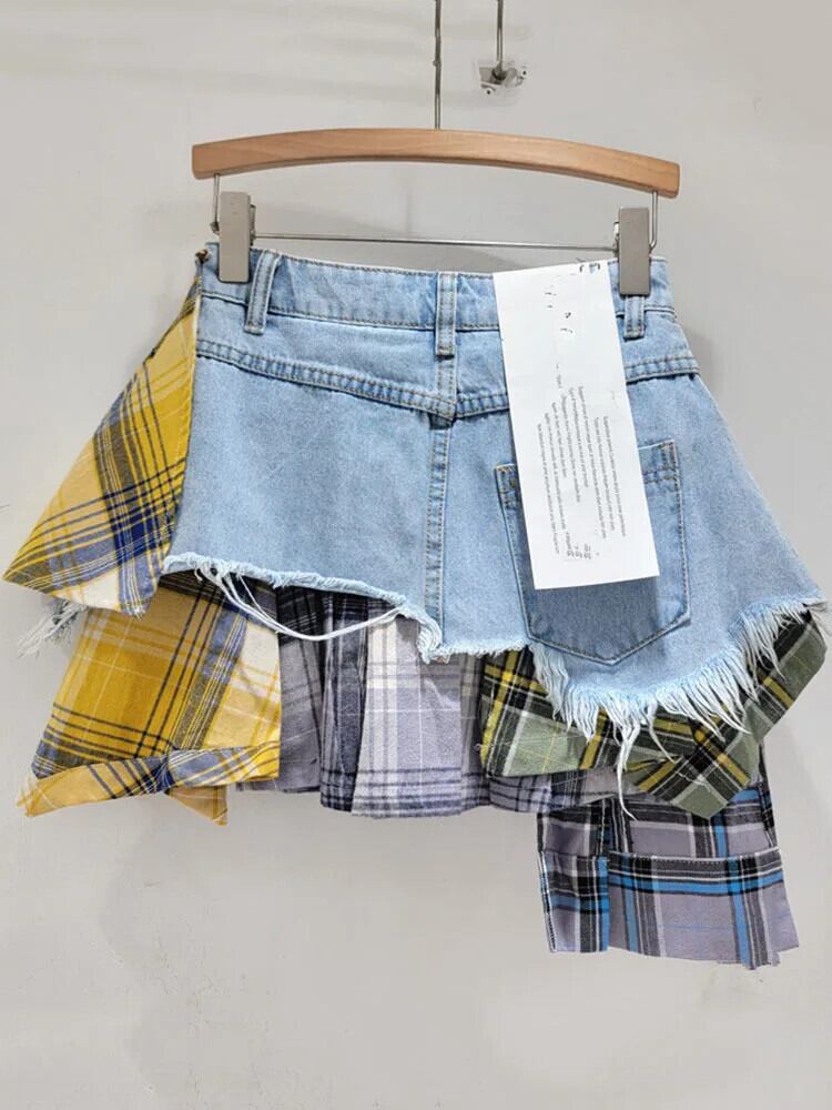 [EWQ] スプライス パッチワーク 3D フラワー ブルー チェック柄 ウエスト A ライン デニム ショーツ イレギュラー スカート レディース 2024 春夏 16U8690 スプリング 春物 サマー 夏物 ブルマー Aライン フラワーデザイン