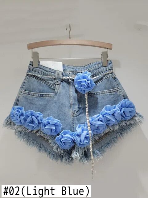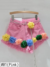 [EWQ] カラフルフラワーテルローエッジデニムショートパンツ レディース ウエストゆったり チェーン Aライン ワイドレッグ ショートパンツ 2024 夏 16U8839 サマー 夏物 ショーツ ブルマー ワイドパンツ フラワーデザイン