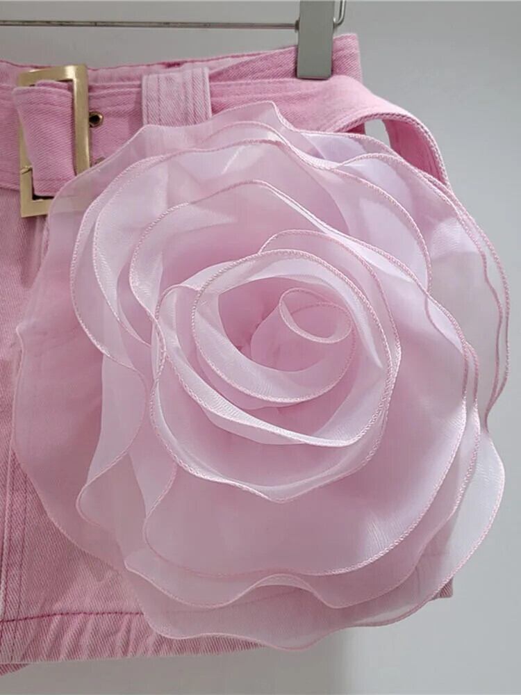 [EWQ] 美しい 3D フラワーデニムスカートウエスト甘いピンクラップヒップベルトショートスカートパンツ 2024 夏 16U8806 大人ガーリー スウィート キュート カジュアル サマー 夏物 ハーネス フラワーデザイン