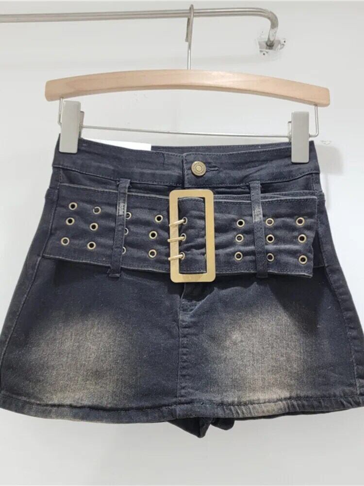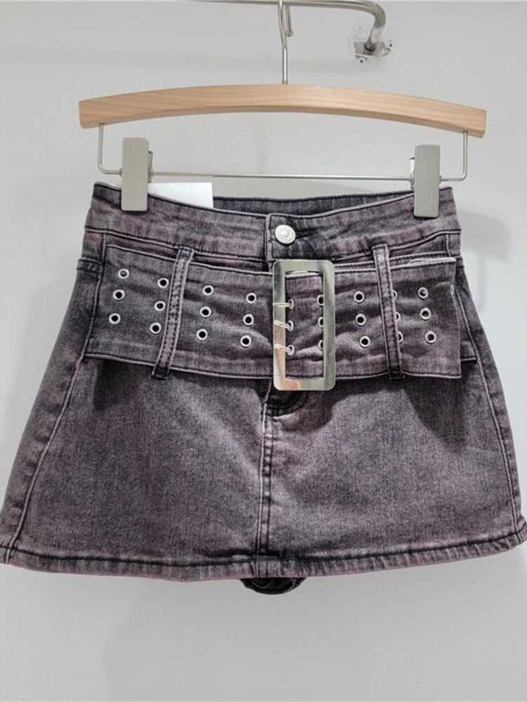 [EWQ] Y2k クールガール ウエスト A ライン ラップ ヒップ ベルト ショート デニム スカート レディース ボトムス 2024 春夏 16U8860 スプリング 春物 サマー 夏物 ハーネス Aライン