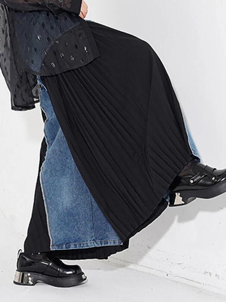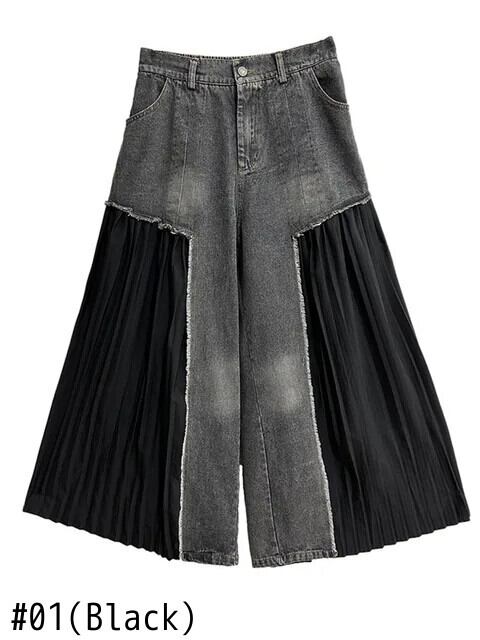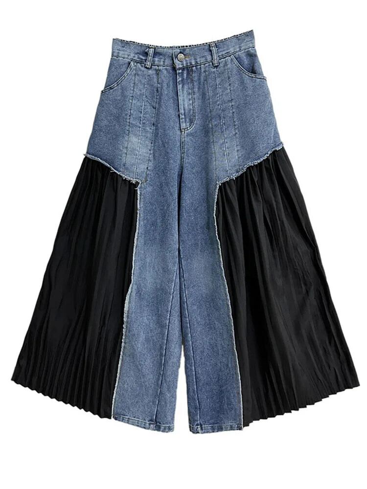 [EWQ] 折り込みパッチワーク ウォッシュドデニムパンツ ゆったり クロップド プリーツ パンツ レディース 2024春夏 16U8583 スプリング 春物 サマー 夏物