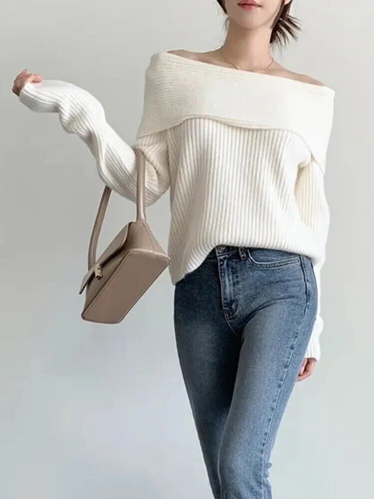 [EWQ] スタイルスラッシュネックオフショルダー長袖セータールーズオールマッチトップレディース2024春夏16U7326 ロング スプリング 春物 ウィンター 冬物