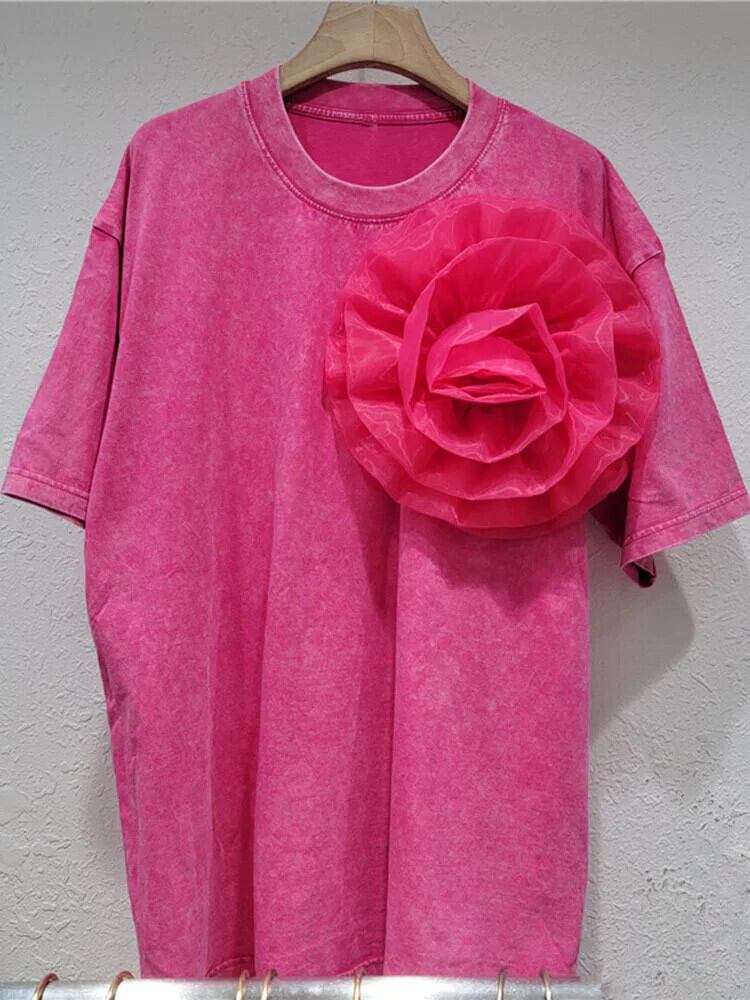 [EWQ] オーバーサイズ ラウンドネック 半袖 3D フラワー 無地 ルーズ Tシャツ トップス レディース 2024 春夏 16U8817 ショート ハーフスリーブ スプリング 春物 サマー 夏物 Oネック ソリッドカラー フラワーデザイン