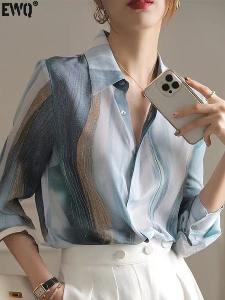 [EWQ] レディース 長袖 美しい グラデーション カラー スタイル ラペル シングルブレスト シャツ 2024 春夏 16U8313 ロング スプリング 春物 サマー 夏物 シルク