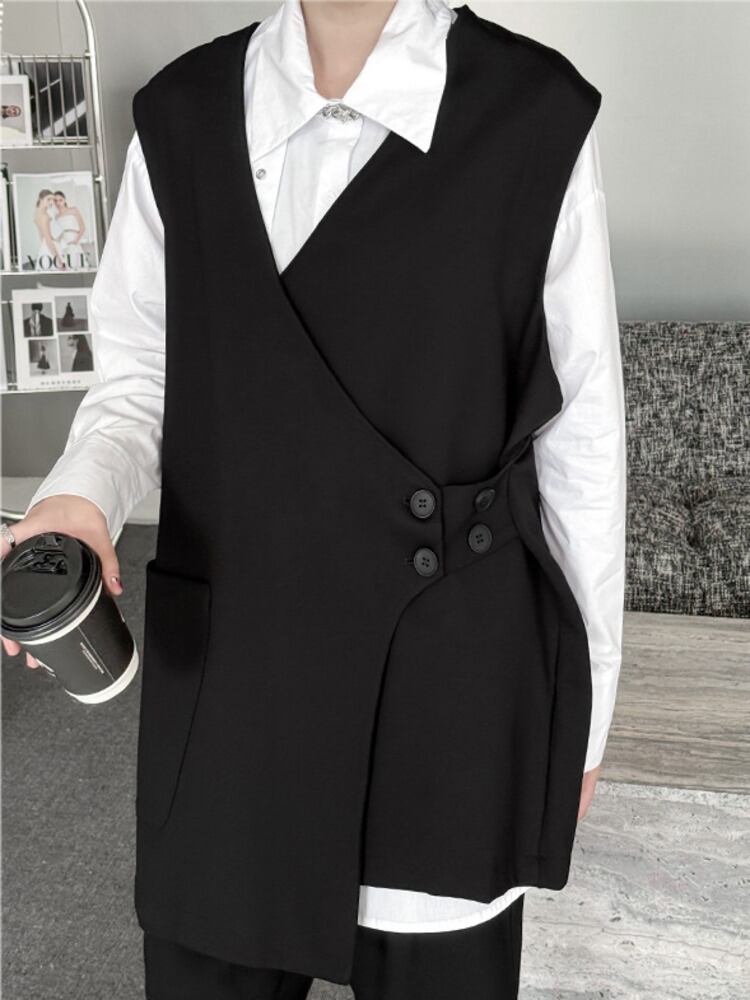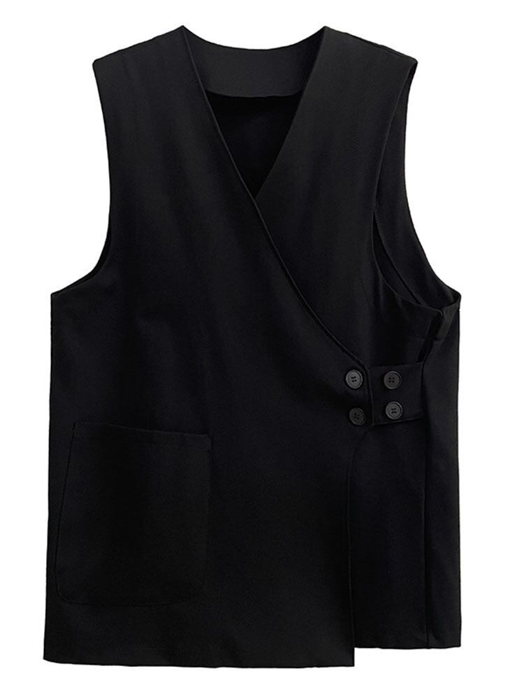 [EWQ] Vネック ルーズボタン ブラック レディース トップス ノースリーブ ベスト ジャケット 2024春夏 16U8588 スプリング 春物 サマー 夏物