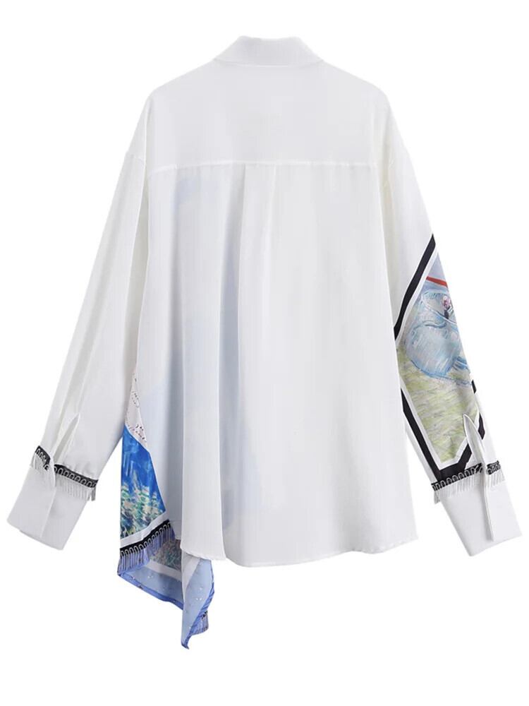 [EWQ] シック白プリントビッグサイズ不規則ブラウス長袖フィットシャツプリントトレンド春秋 ロング ホワイト スプリング 春物 オータム 秋物