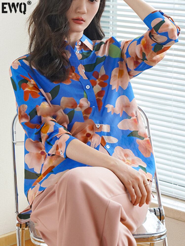 [EWQ] 美しいフラワープリントシャツレディースルーズ長袖ラペルシングルブレストブラウストップ 2024 春夏 16U8288 ロング スプリング 春物 サマー 夏物 シルク フラワーデザイン