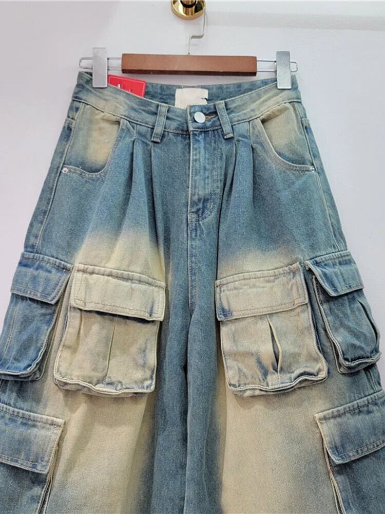 [EWQ] ストリート マルチポケット ウォッシュド オールド マルチポケット デニム パンツ ルーズ 万能 パンツ レディース 2024春夏 16U8826 スプリング 春物 サマー 夏物 ポケット多め