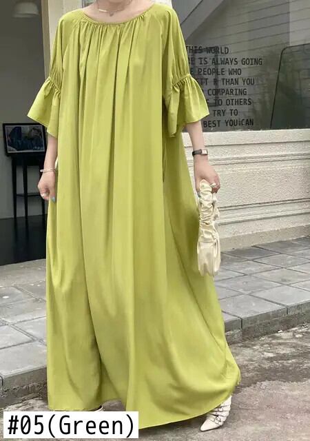 [EWQ] きれいめ無地 ゆったり プリーツ レースアップ 膝丈 ホーン 五分袖 ロング レディース ワンピース 2024春夏 16U8917 半袖 ハーフスリーブ スプリング 春物 サマー 夏物 ソリッドカラー