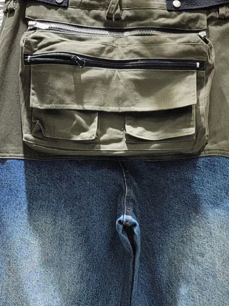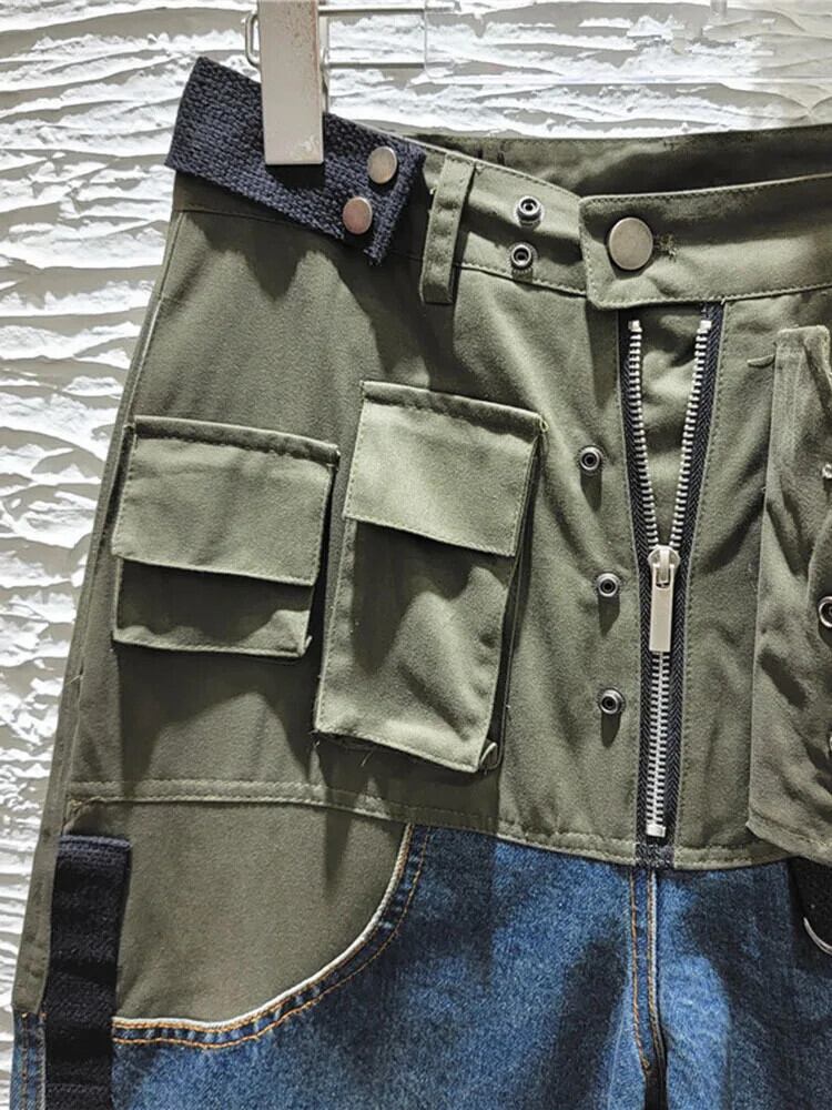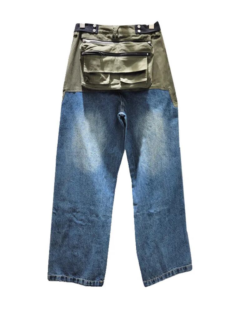 [EWQ] ストリートパッチワーク大きポケットスプライシングワイドワークストレートレッグジーンズ長ズボン 2024 春秋 16U8823 ロング スプリング 春物 オータム 秋物