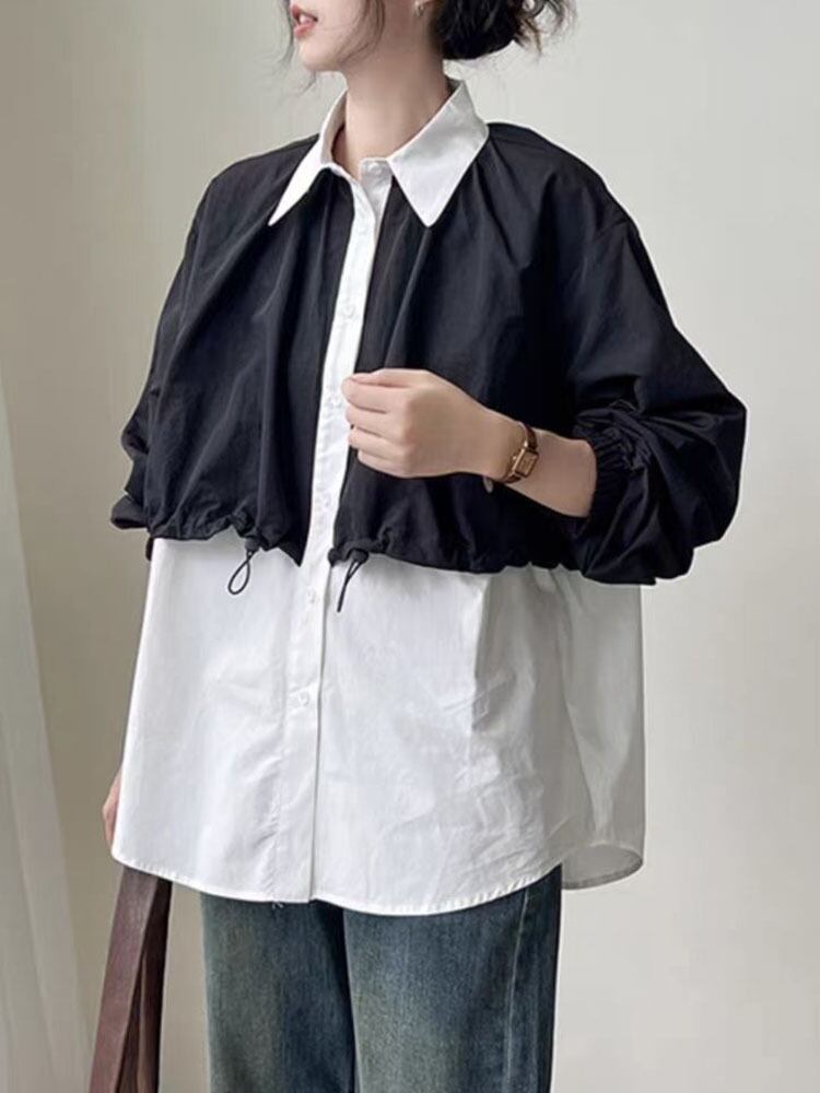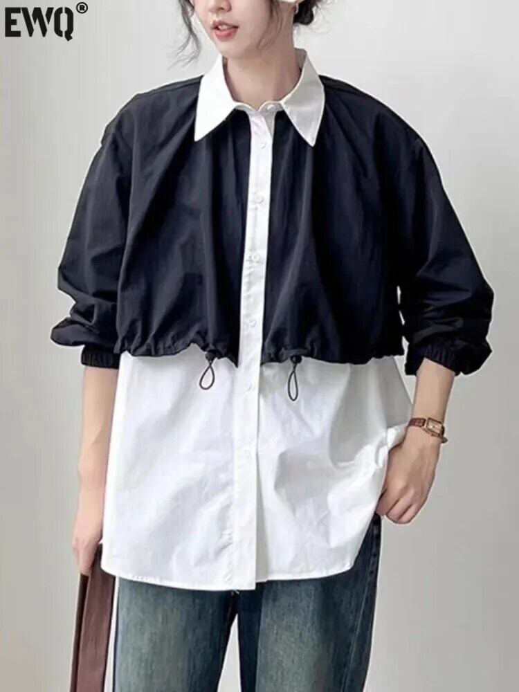 [EWQ] シックコントラストカラー パッチワーク フェイク ツーピース 長袖 シングルブレスト シャツ レディース 2024 春夏 16U8359 ロング スプリング 春物 サマー 夏物