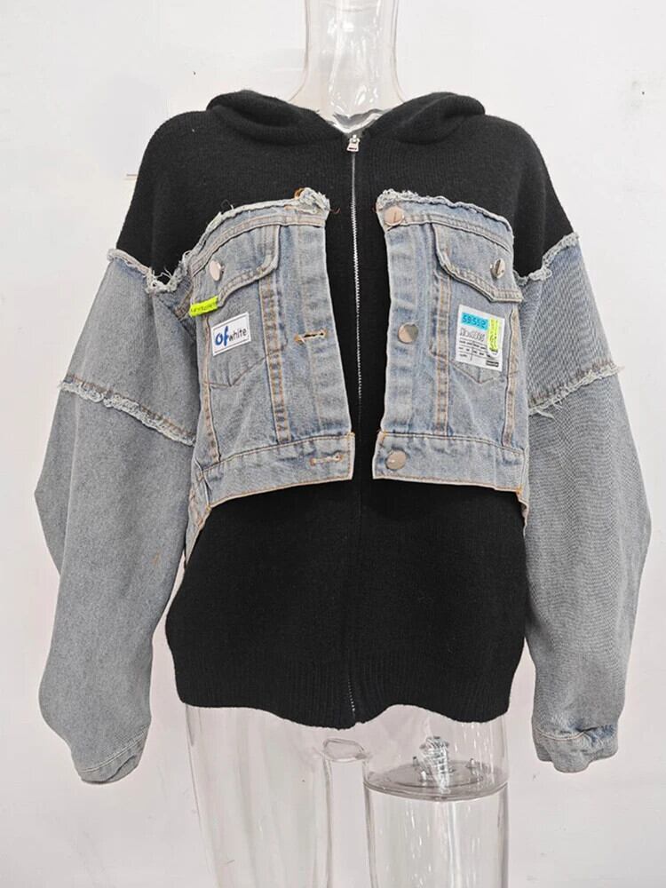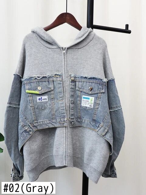 [EWQ] デニムパッチワークカーディガンコートレディース長袖フード付きルーズレターパッチセータージャケット秋冬16U3893 ロング オータム 秋物 ウィンター 冬物