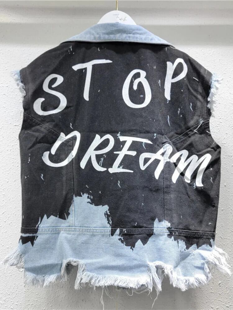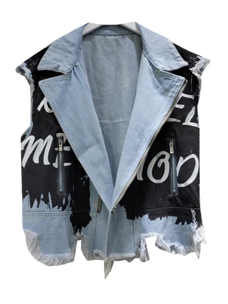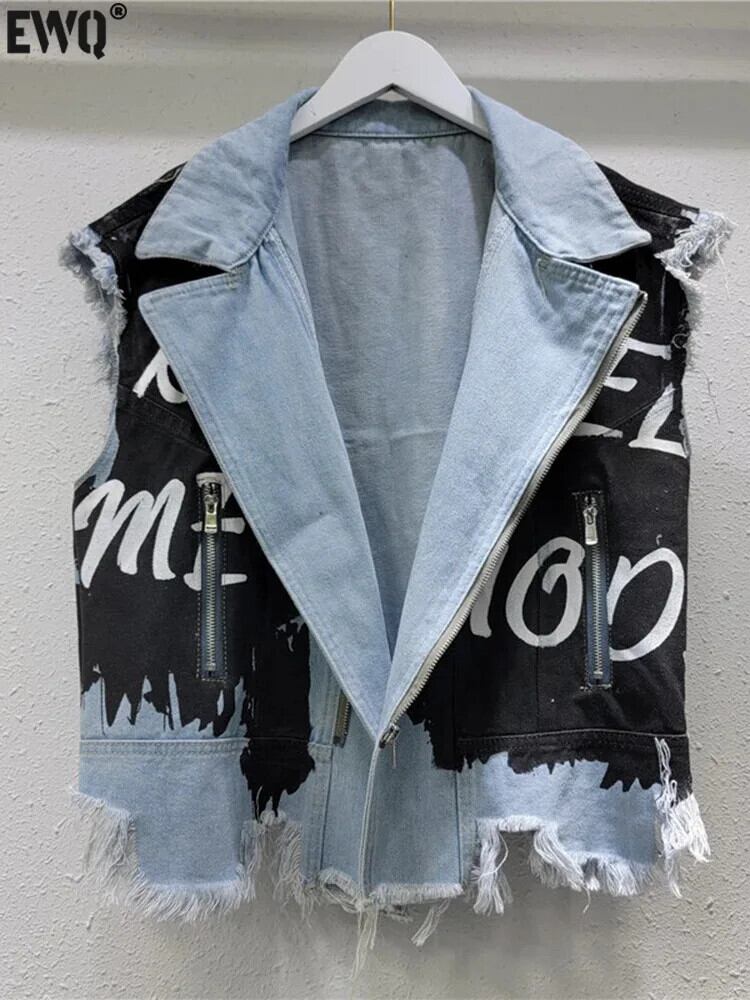 [EWQ] ストリートテル ラギッドエッジ ショート デニム ベスト ラペル ジッパー ノースリーブ ジャケット コート レディース 2024 春夏 16U8970 スプリング 春物 サマー 夏物